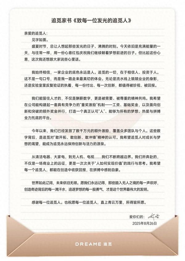 “与罕见激发比较,此次的200万元仅仅阳光普照的浅薄操作”,追觅职工暗意,“公司浅薄也有好多其他福利待遇,比如咱们的节礼会比较平庸,七夕会收到公司的吹风机,也会有公司组织的夜宵节、演唱会。”