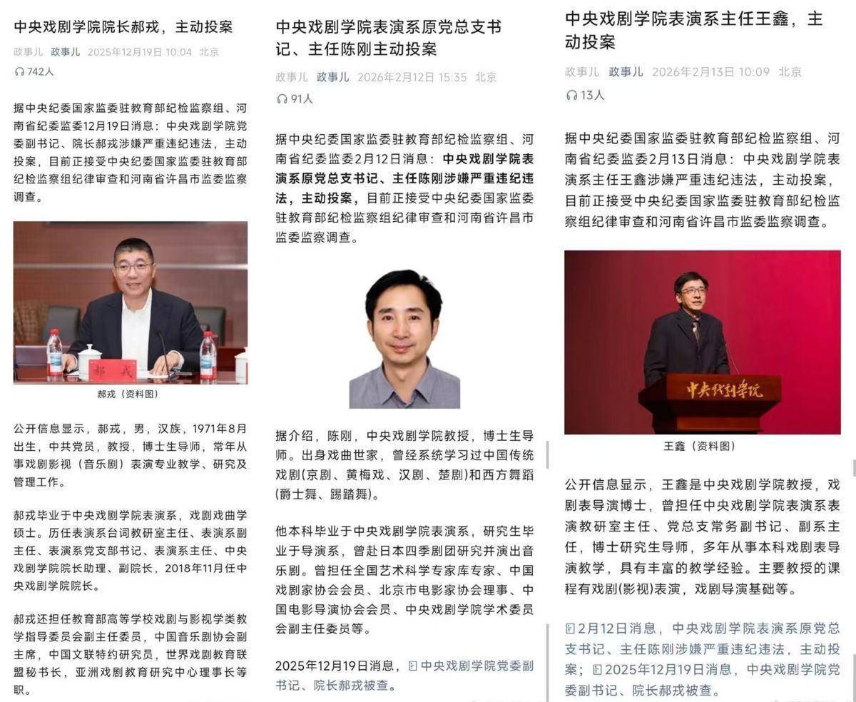 此前,2025年12月19日,中央戏剧学院党委副布告、院长郝戎涉嫌严重违法犯警,已主动投案;而2月12日,中央戏剧学院饰演系原党总支布告、主任陈刚涉嫌严重违法犯警,也已主动投案。