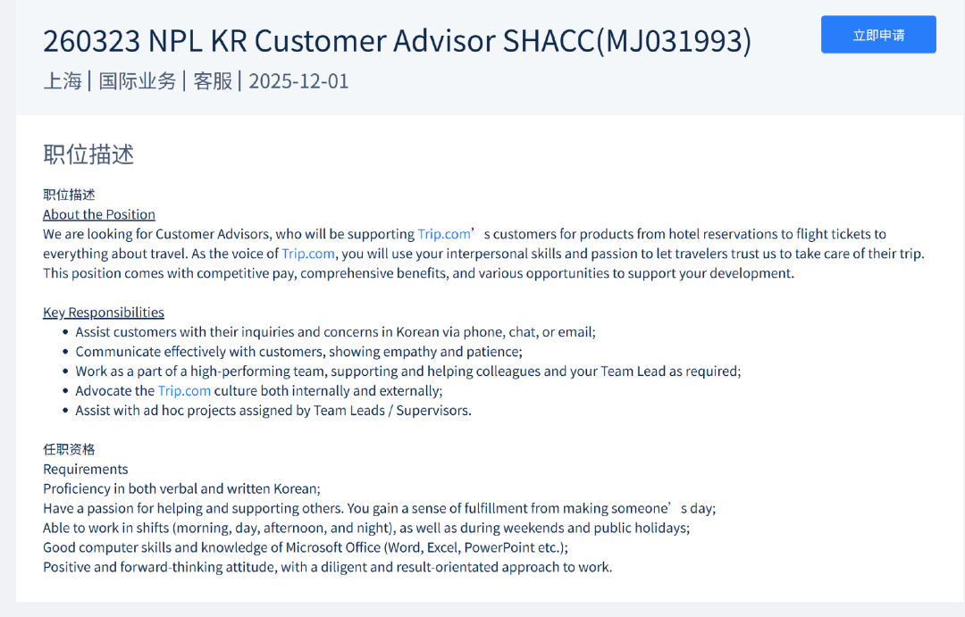 携程官网上,国际客服中的一类岗亭被称作Customer Advisor(客户参谋人)。职位形容里写着,你动作“Trip.com的形象大使”,“将利用你的东谈主际往来技艺和热心,让旅行者相信咱们,将他们的旅程交给咱们安排”。