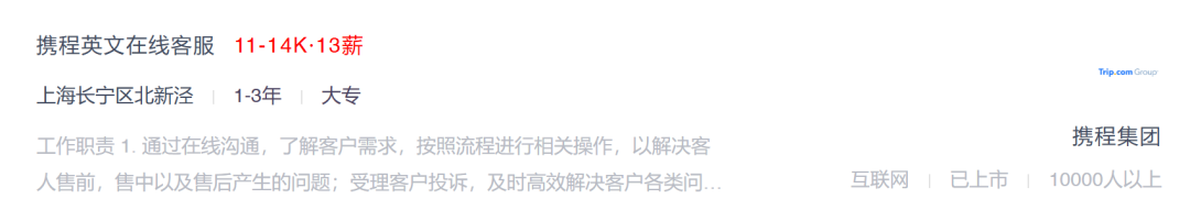 领先是极具劝诱力的薪资。招聘网站上显现, 携程英文在线客服岗亭的薪资在11000元到14000,且有13薪。这个薪资高过了一些互联网大厂的低级运营岗,部分“大模子标注”“AI教授”岗,以及许多参议公司的助理岗亭薪资。